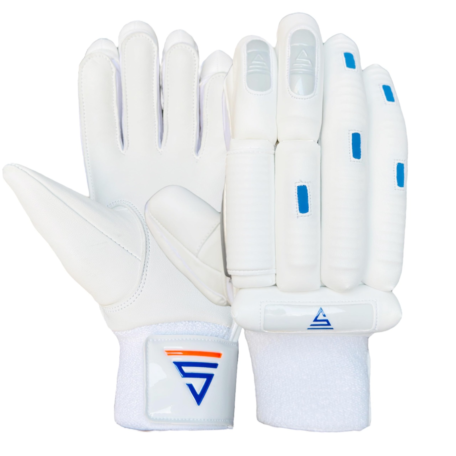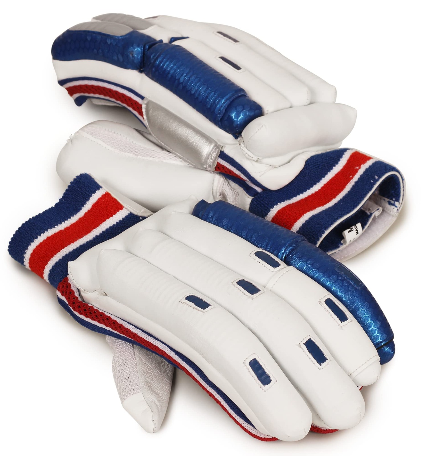 Batting gloves are protective handwear designed to provide cricketers with a secure grip and comfort while batting. They are typically made with a combination of materials like leather, foam, and synthetic fabrics, and feature designs that enhance flexibility and ventilation.
